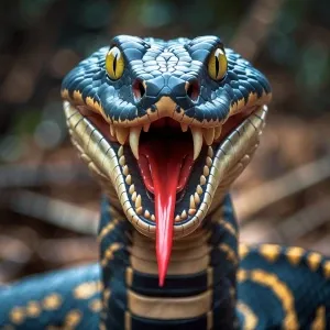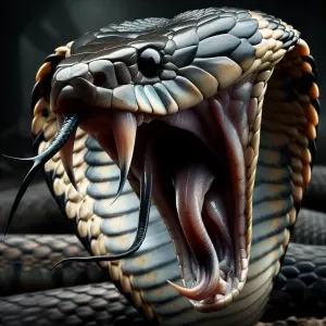 «Detailed depiction of a king cobra in mid-strike, with its hood...»