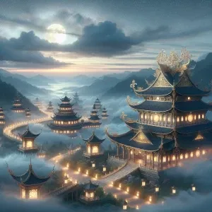 «A grand Eastern palace shrouded in swirling mist, its curved roo...»