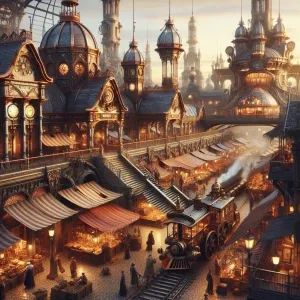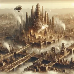 «A sprawling steampunk city with towering brass-clad buildings co...»