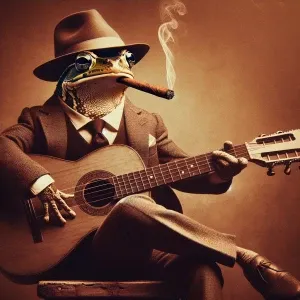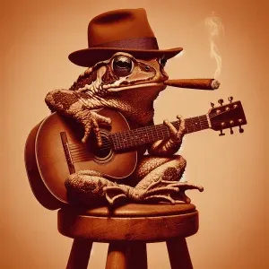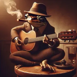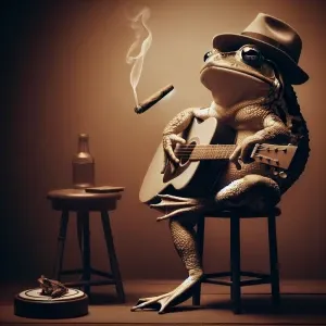 «Anthropomorphic toad wearing a fedora, sitting on a stool, smoki...»