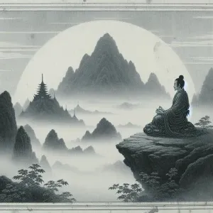 «A lone figure in a flowing robe meditating on a misty mountainto...»