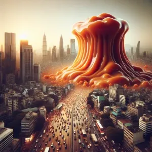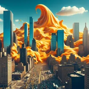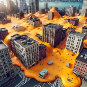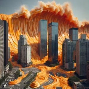 «Create an image of a massive orange pudding tsunami engulfing a...»