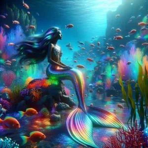 «A shimmering mermaid sitting on a rock made of glowing coral, su...»