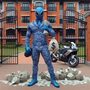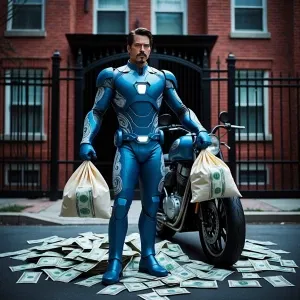 «Iron Man, clad in a all blue armor suit adorned with a paisley p...»