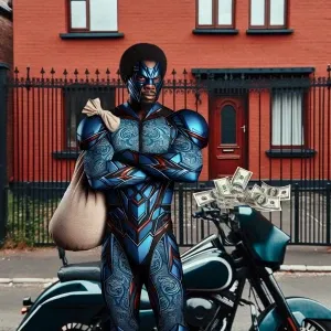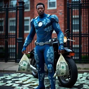 «Afrocentric ironMan, clad in a all blue armor suit adorned with...»