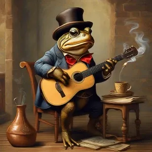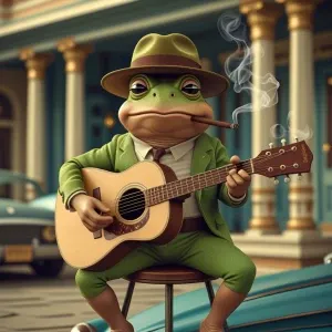 «Anthropomorphic toad wearing a fedora, sitting on a stool, smoki...»
