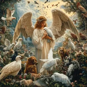 «Design an ethereal heaven where angels and a variety of animals...»