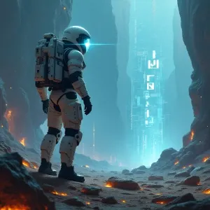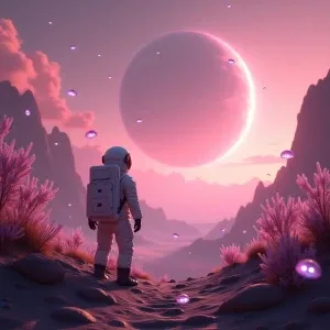 «An astronaut discovering a surreal alien planet with pink skies,...»