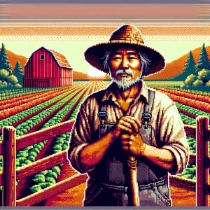 «A weathered farmer in a wide-brimmed straw hat, standing beside...»