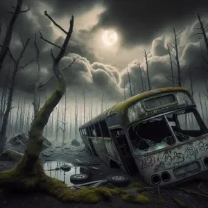 «A desolate scene featuring an overturned, moss-covered bus lying...»