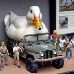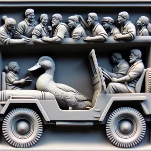«Create a 3d bas relief of a duck sitting inside of a Jeep, facin...»