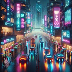 «A bustling urban street lined with glowing billboards and reflec...»
