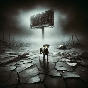 «A lone dog standing on cracked asphalt in front of a crumbling b...»