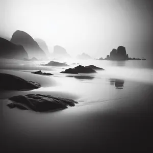 «A monochrome landscape of a deserted beach, the smooth sand, jag...»