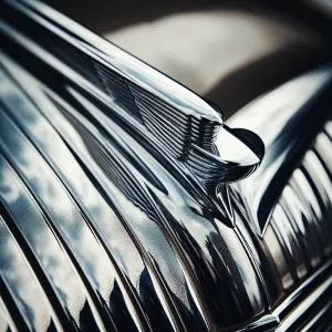 «A detailed shot of a vintage car’s hood ornament, with the chrom...»