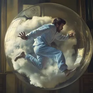 «Create a humorous image of a person in pajamas frantically rushi...»