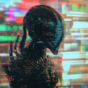 «Depict a glitchy alien cyborg composed of VHS static and pixelat...»