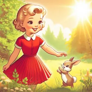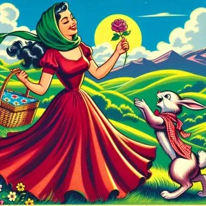 «A vibrant, classic cartoon scene showing a young woman in a flow...»