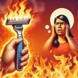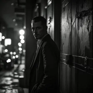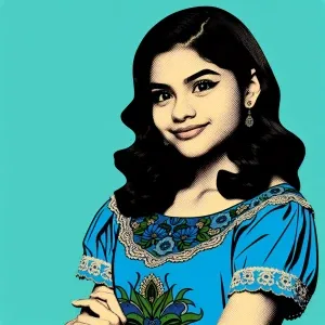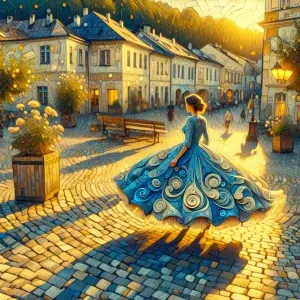 «A young woman wearing a finely detailed blue dress, walking alon...»