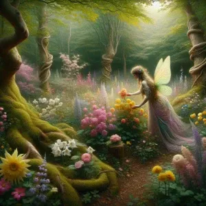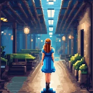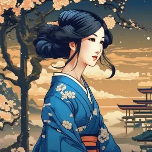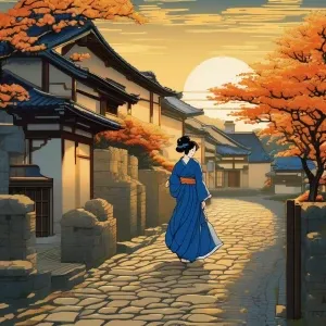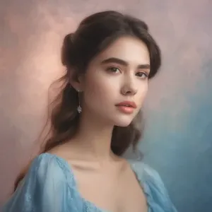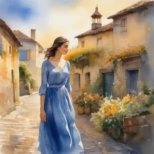 «A young woman wearing a finely detailed blue dress, walking alon...»