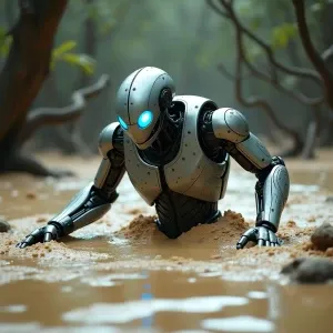 «Create an image of a futuristic robot trapped in quicksand, stru...»