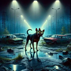 «A two-headed dog prowling a deserted parking lot, its glowing ey...»