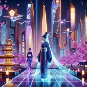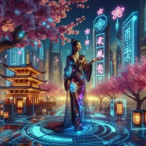 «A beautiful woman wearing a sleek, futuristic qipao illuminated...»