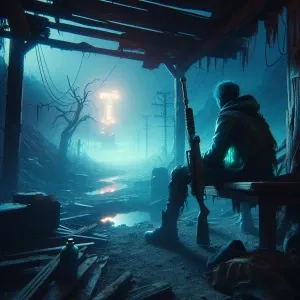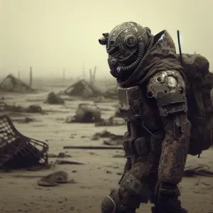«A lone wanderer in tattered, futuristic armor walking through a...»
