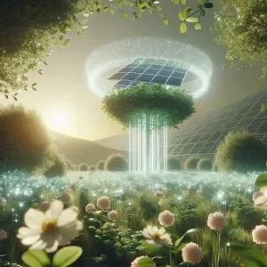 «A single solar tower surrounded by flowering plants, with soft,...»