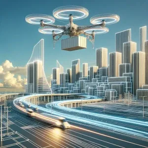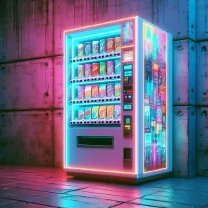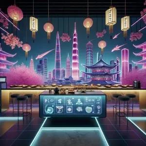 «A minimalist sushi bar with sleek, neon-lit counters and a holog...»