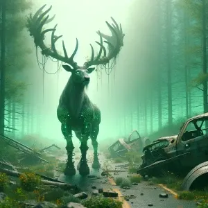 «A grotesque, horned deer with glowing antlers standing in the mi...»