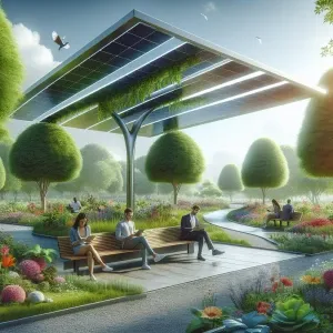 «A bustling community plaza filled with people in casual, eco-fri...»