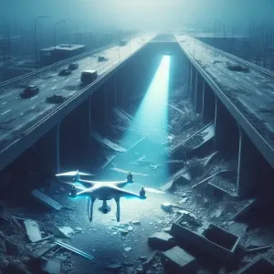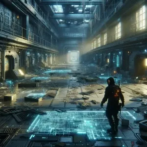 «A cybernetically enhanced scavenger cautiously exploring the rui...»