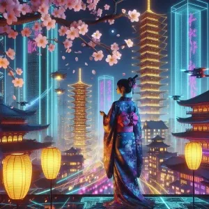 «A poised woman in a modern kimono-like outfit, her hair adorned...»