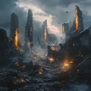 «Desolate ruins glowing with soft mystical energy, elemental crea...»