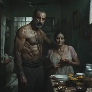 «An Indian man, showing muscular build and signs of a rough past,...»