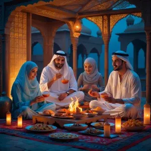 «Eine beduinische Familie in einer wüstenähnlichen Gegend, hocken...»