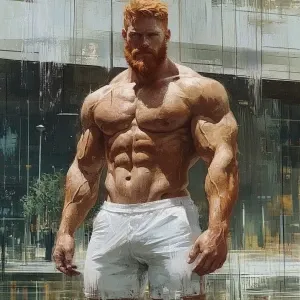«The image displays a ginger, bearded hairy chest, muscular man s...»
