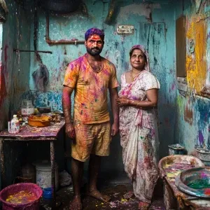 «A well-built, perspiring Indian man engaging in Holi festivities...»