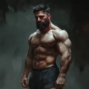 «Generate an image of a muscular, bearded man dressed in a snug t...»