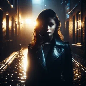 «A young woman standing in a rain-soaked alley, her face dramatic...»