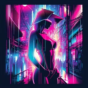 «A beautiful woman standing under a neon sign, her silhouette sof...»