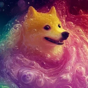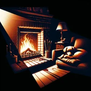 «A small dog curled up by a fireplace, the warm firelight illumin...»