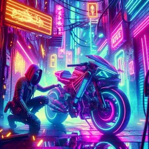 «A neon-lit alley where a hooded figure adjusts the controls of a...»