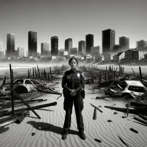 «Create an image depicting a devastated beach town after a fire,...»