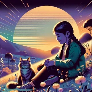 «A young girl sitting on a grassy hill with her cat, a soft sunse...»