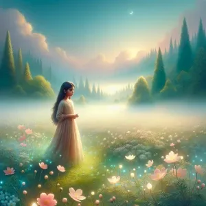 «A young girl standing in a meadow filled with hazy, glowing flow...»