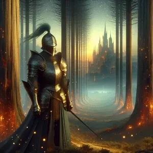 «A knight in ornate armor standing in a sunlit forest clearing, s...»