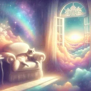 «A cozy living room scene where a cat stretches lazily on a cushi...»