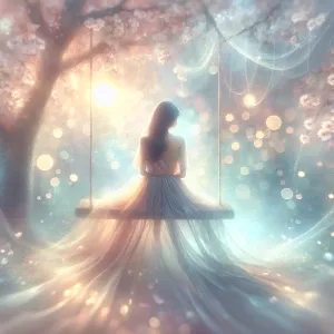 «A woman sitting on a garden swing, her dress flowing softly in t...»